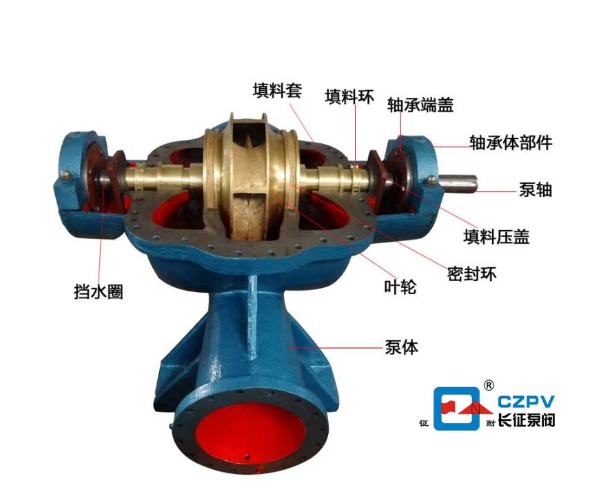 單級(jí)雙吸離心泵的基本構(gòu)造是有幾部分組成的,組成部分有葉輪,泵體,泵蓋,擋水圈,泵軸,軸承,密封圈,軸向力平衡裝置,填料密封。